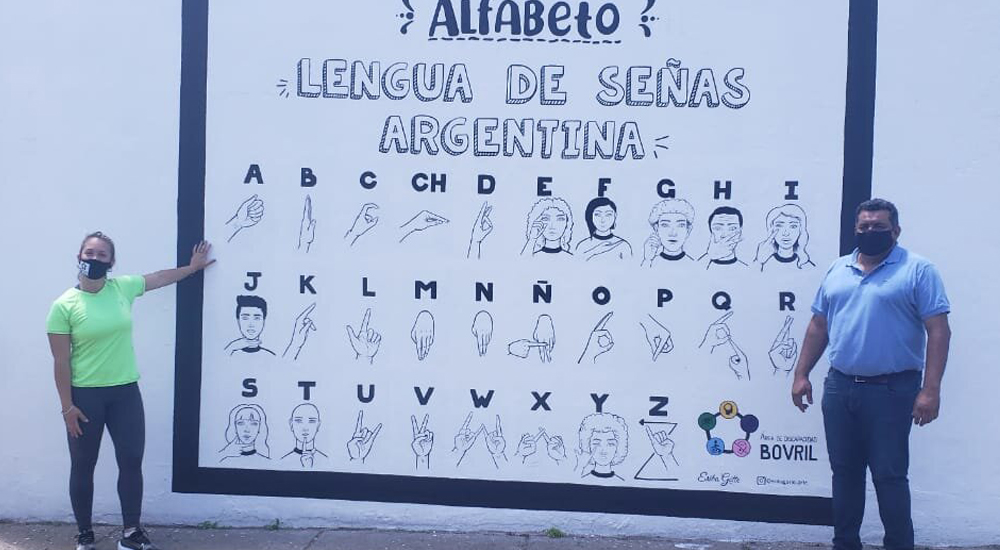 Autoridades municipales en conjunto con directivos y docentes de la Escuela Secundaria y Superior Nº 7 "José Manuel Estrada", de Bovril, pintaron un mural con el alfabeto de lengua de señas de Argentina. Se trata de una pintura de más de dos metros de altura con el instructivo al alcance de los vecinos.