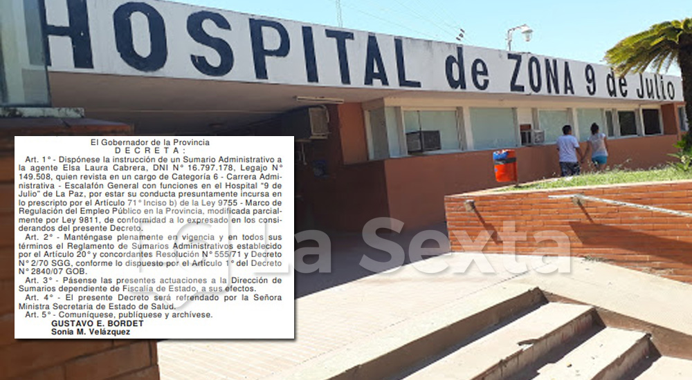 El gobierno provincial informó la apertura de un sumario administrativo a un agente del Hospital Zonal 9 de Julio, de La Paz, por el presunto abandono de su servicio desde marzo de 2018. La investigación sumarial se abrió mediante el decreto Nº 258, firmado por la ministra de Salud provincial, Sonia Velázquez.