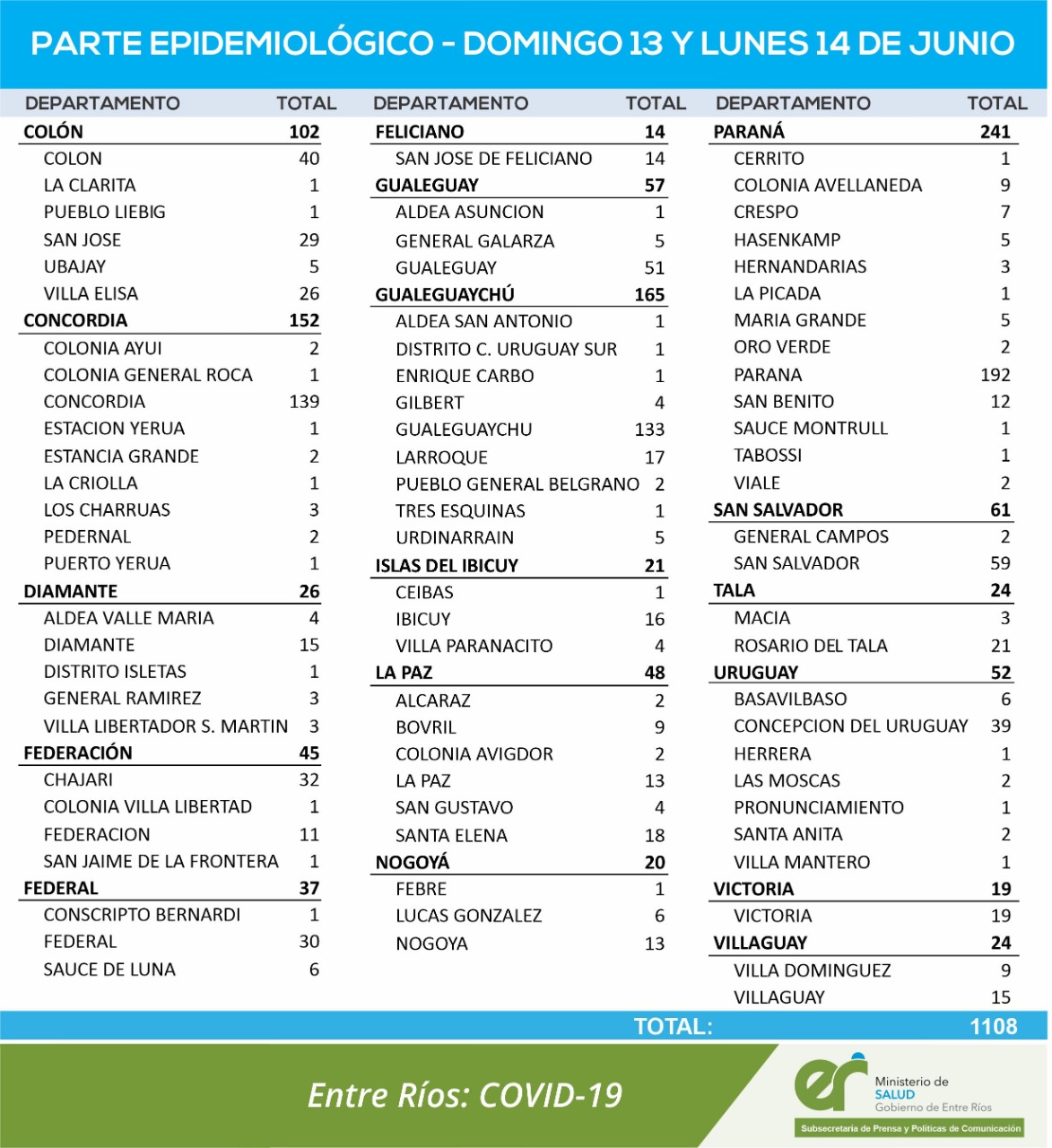El área de Vigilancia Epidemiológica del Ministerio de Salud confirmó que en Entre Ríos se registraron 1.108 nuevos casos de coronavirus, los que se dividen en 702 el domingo y 406 el lunes.