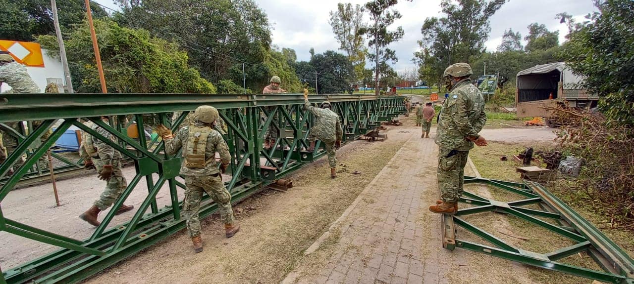 Integrantes del Batallón de Ingenieros Blindado 2 de Concepción del Uruguay, Unidad de Ingenieros del Ejército Argentino, instaló este miércoles el puente Bailey en el ingreso al camping Pirayú, de Piedras Blancas, en reemplazo al badén que cedió ante las lluvias caídas el pasado 10 de abril.