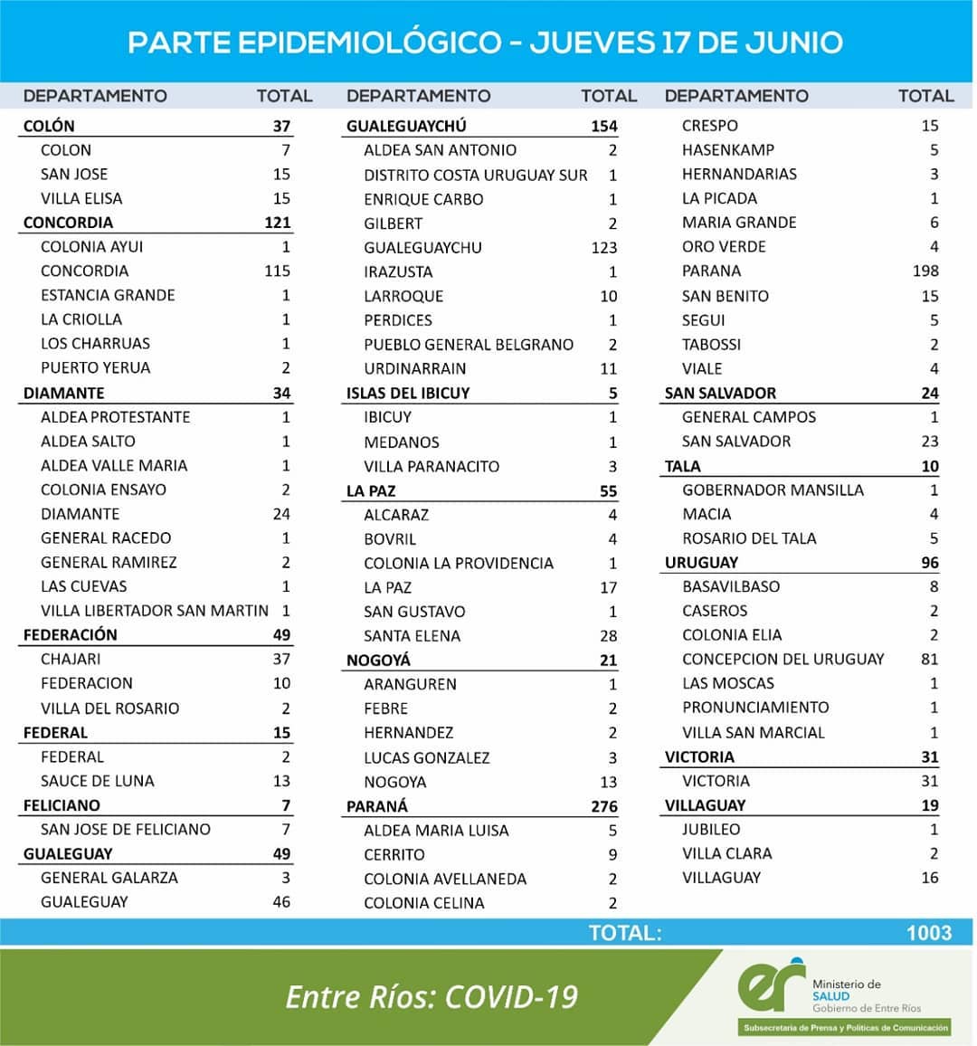 El área de Vigilancia Epidemiológica del Ministerio de Salud confirmó que en Entre Ríos este jueves se registraron 1.003 nuevos casos de coronavirus.