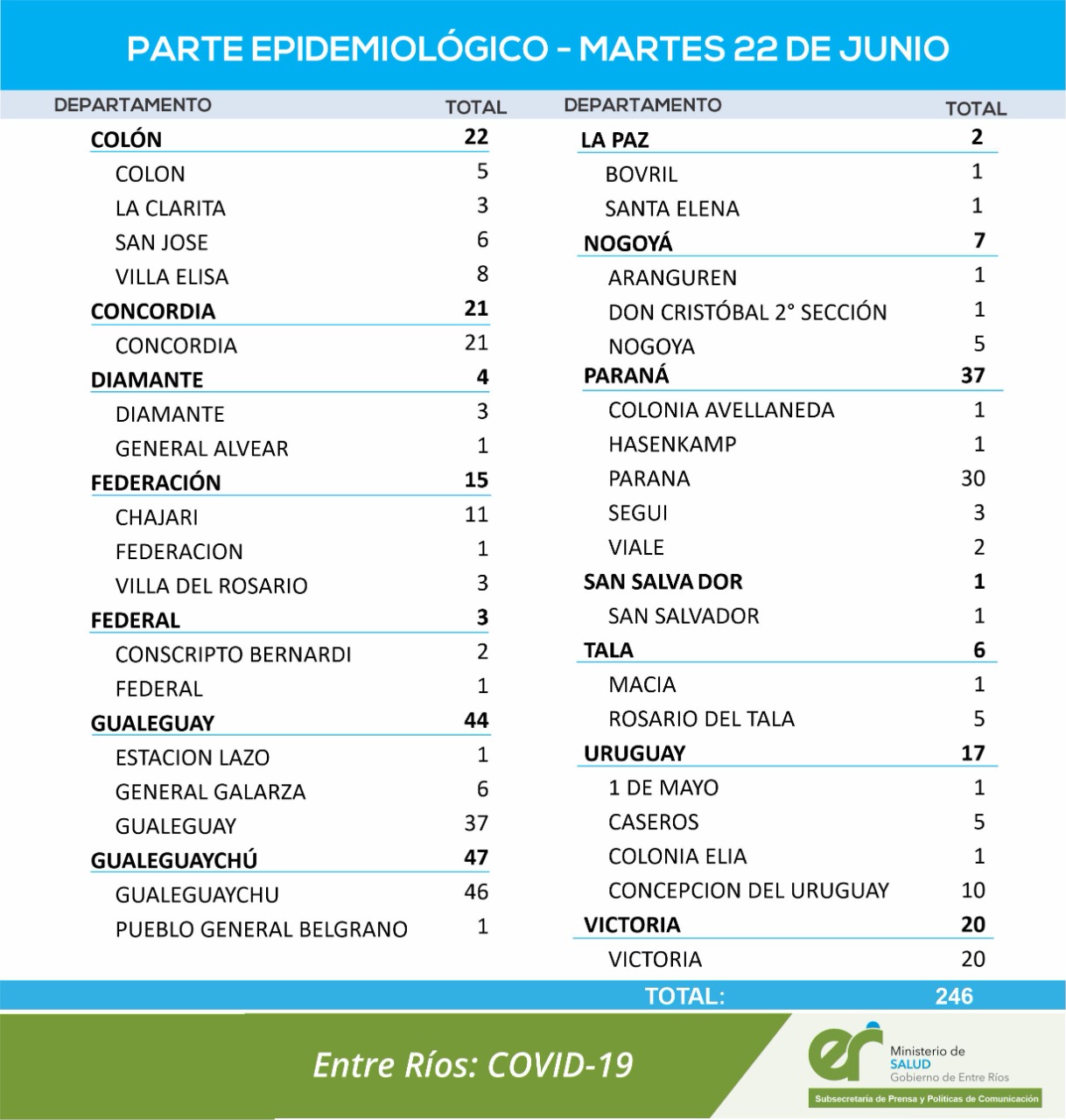 El área de Vigilancia Epidemiológica del Ministerio de Salud confirmó que en Entre Ríos este martes se registraron 246 nuevos casos de coronavirus.