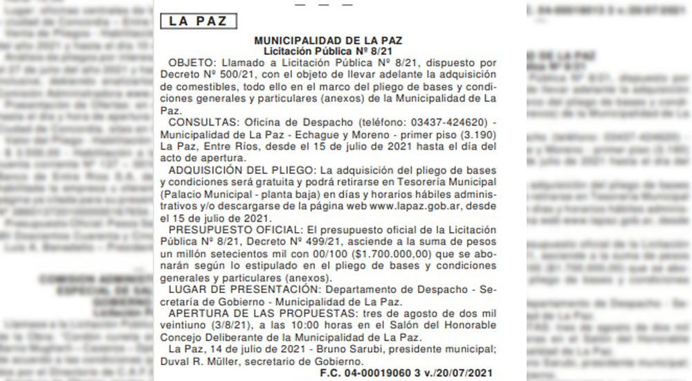 La Municipalidad de La Paz llamó a licitación pública Nº 8/21 para adquirir comestibles con un presupuesto oficial que asciende a $1.7000.000. Los alimentos serán destinados a la realización de módulos para entregar en comedores municipales y atender a las familias en situación de vulnerabilidad.