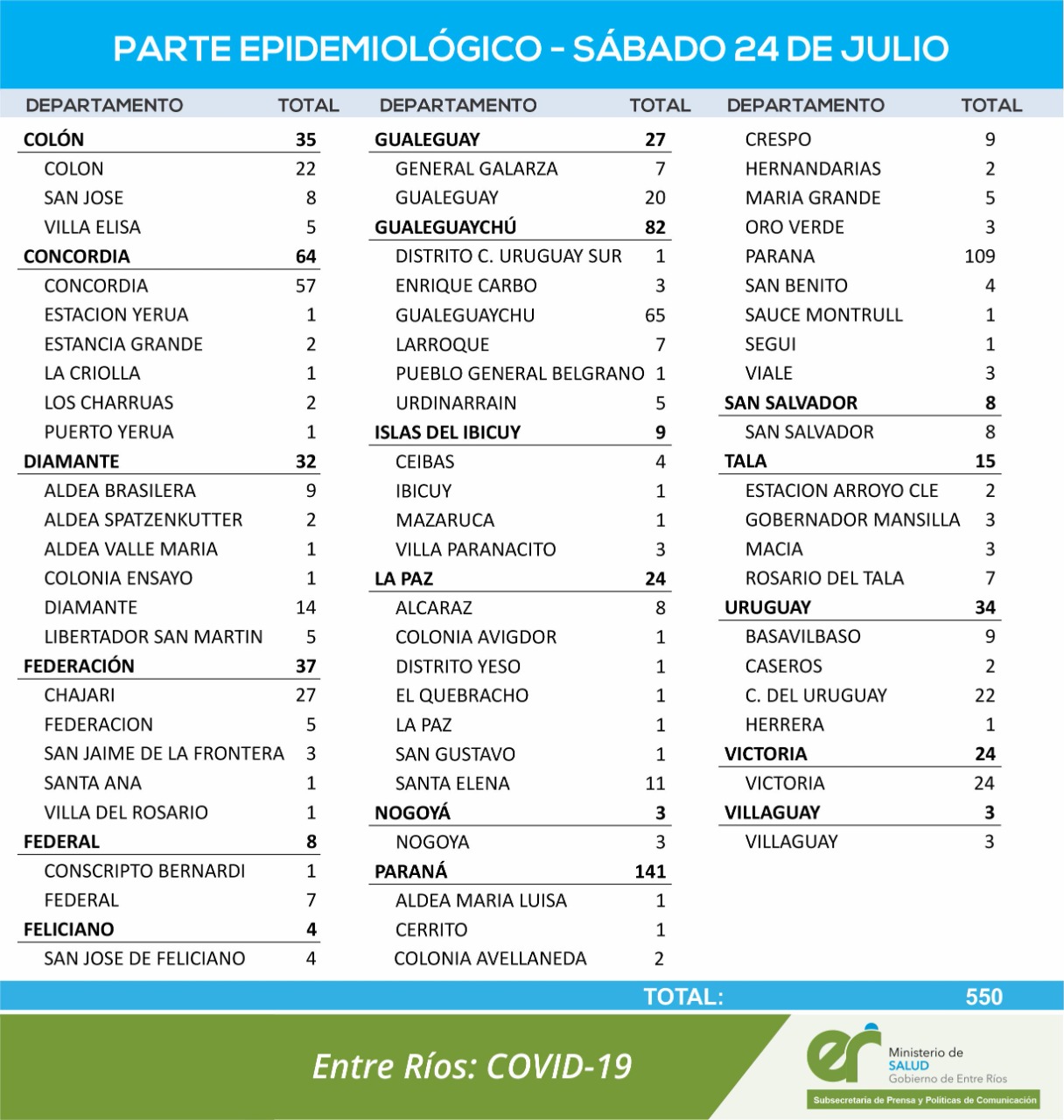 El área de Vigilancia Epidemiológica del Ministerio de Salud confirmó que en Entre Ríos este sábado se registraron 550 nuevos casos de coronavirus.