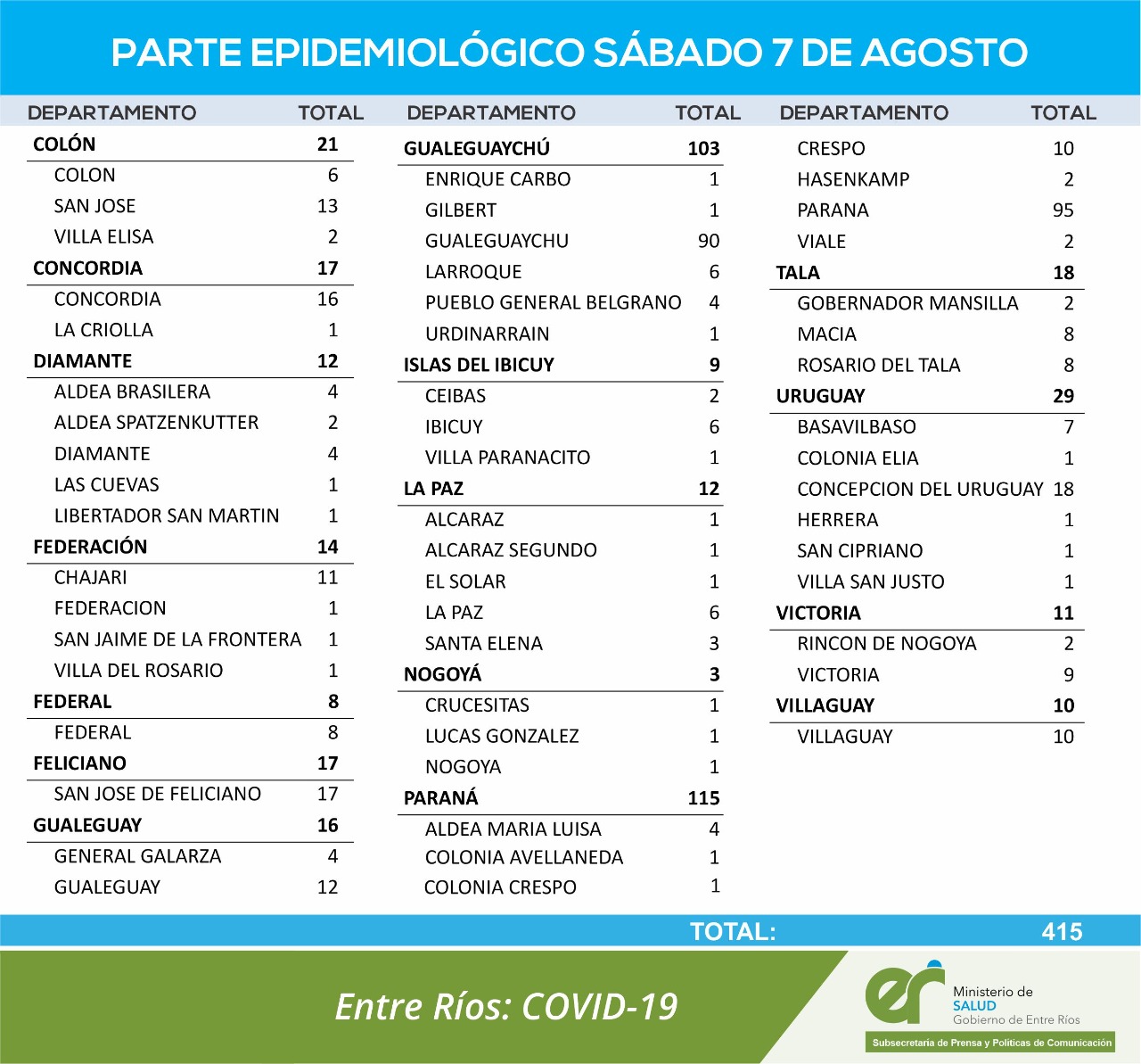 El área de Vigilancia Epidemiológica del Ministerio de Salud confirmó que en Entre Ríos este sábado se registraron 415 nuevos casos de coronavirus.