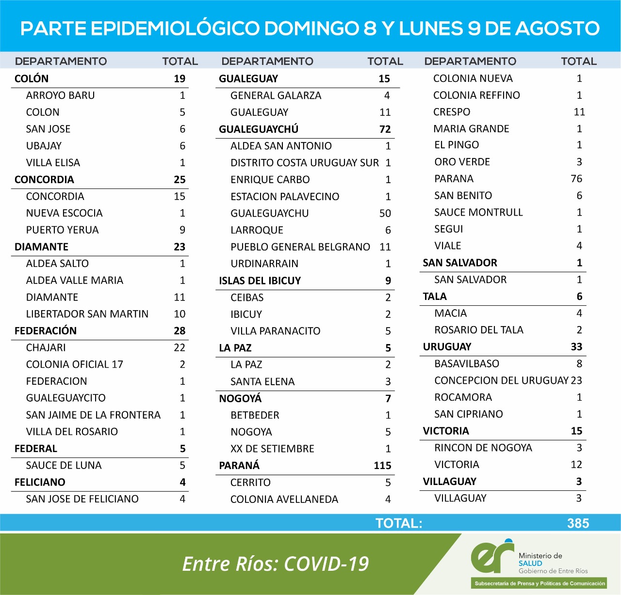 El área de Vigilancia Epidemiológica del Ministerio de Salud confirmó que en Entre Ríos entre el domingo 8 y el lunes 9 de agosto se confirmaron 385 nuevos casos de coronavirus.