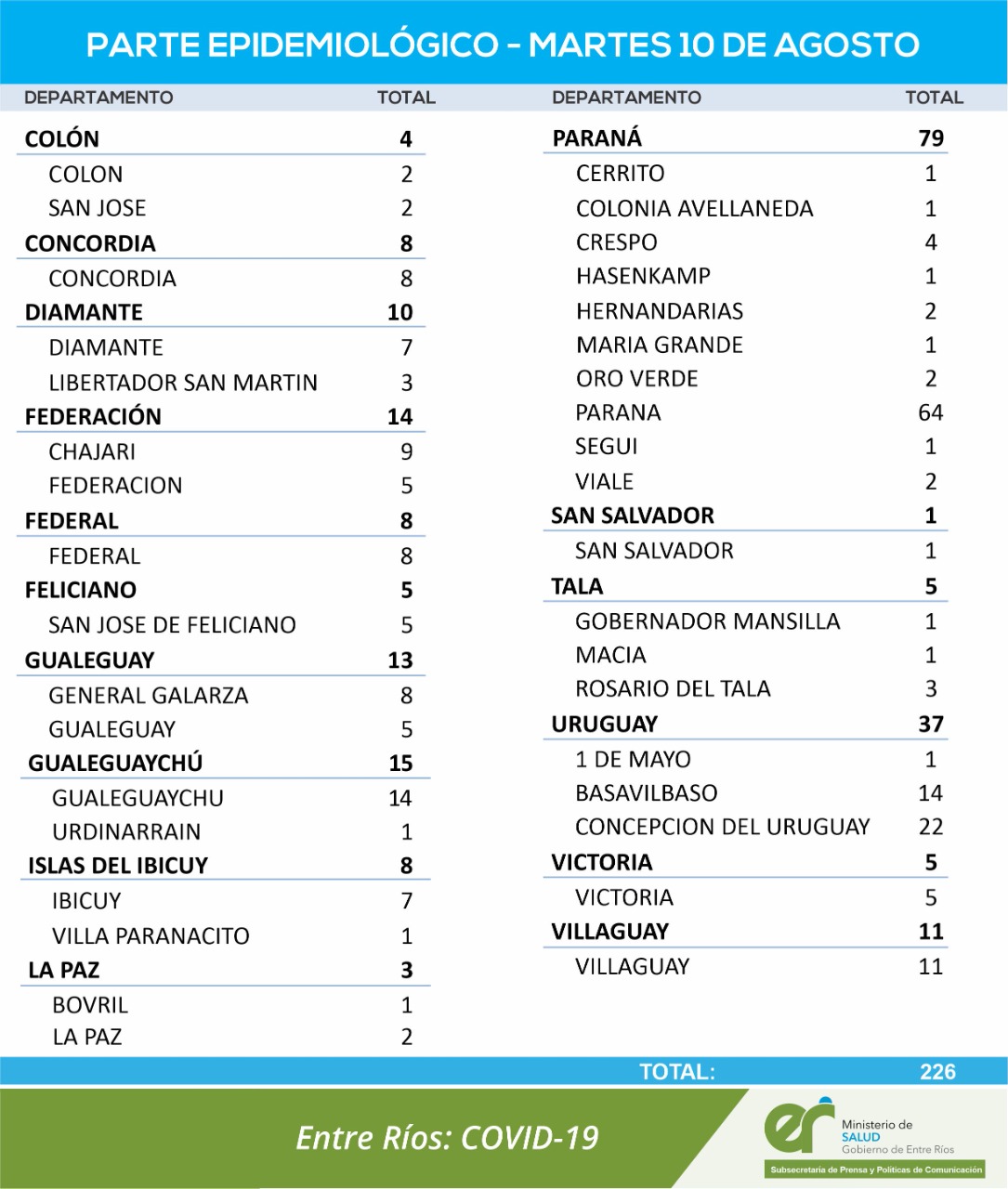 El área de Vigilancia Epidemiológica del Ministerio de Salud confirmó 226 nuevos casos de coronavirus en Entre Ríos este martes, la cantidad diaria más baja en meses.