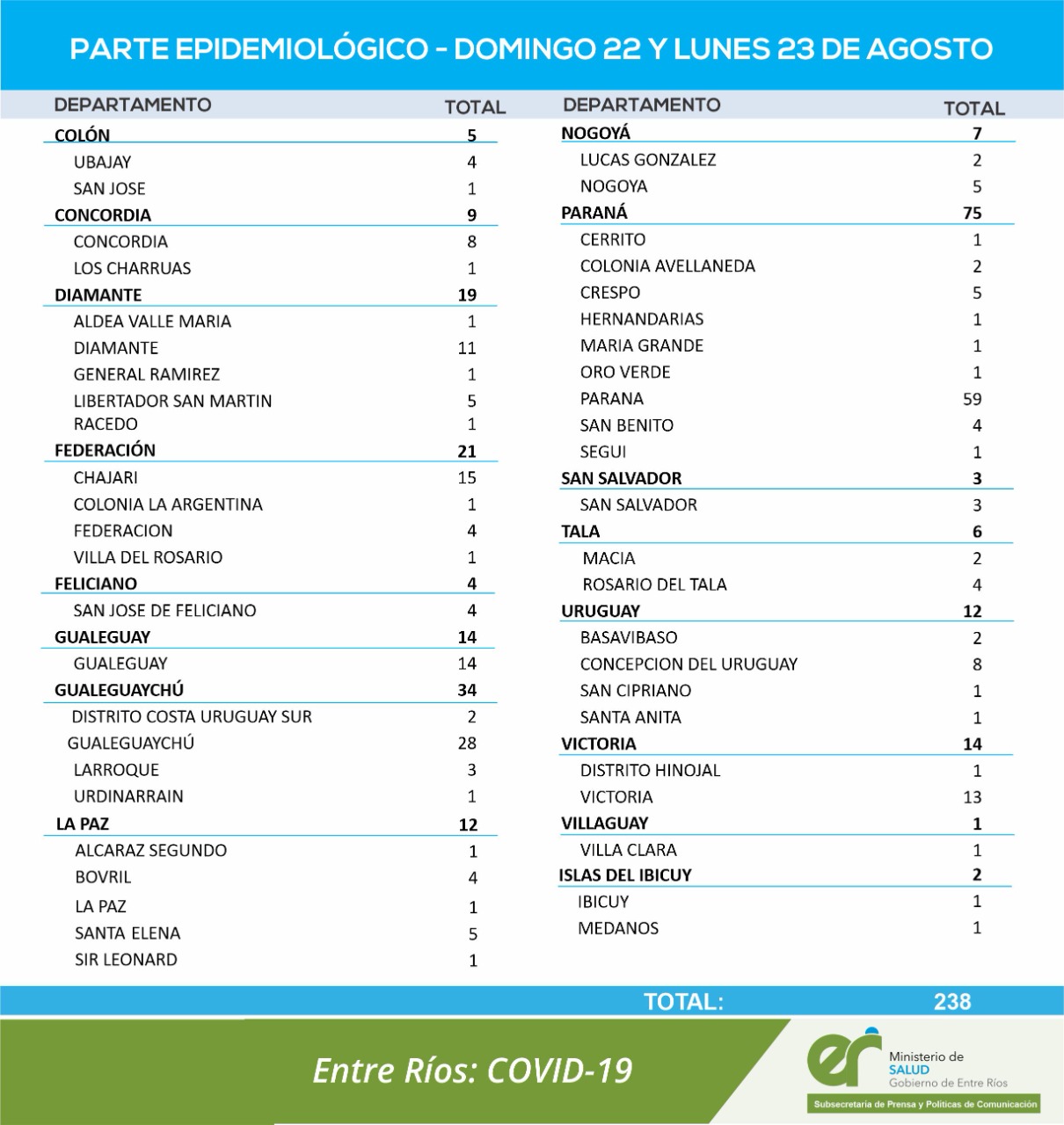 El área de Vigilancia Epidemiológica del Ministerio de Salud confirmó que en Entre Ríos se han sumado 238 casos de coronavirus que corresponden a la suma de dos días: 136 del domingo 22 y 102 del lunes 23 de agosto.