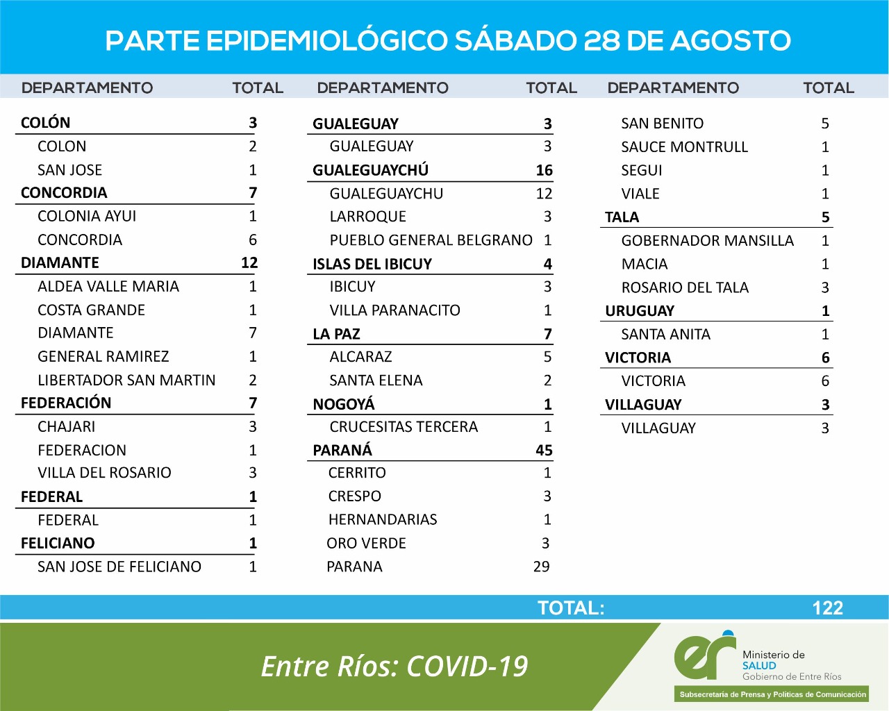 El área de Vigilancia Epidemiológica del Ministerio de Salud confirmó que en Entre Ríos este sábado se registraron 122 nuevos casos de coronavirus.