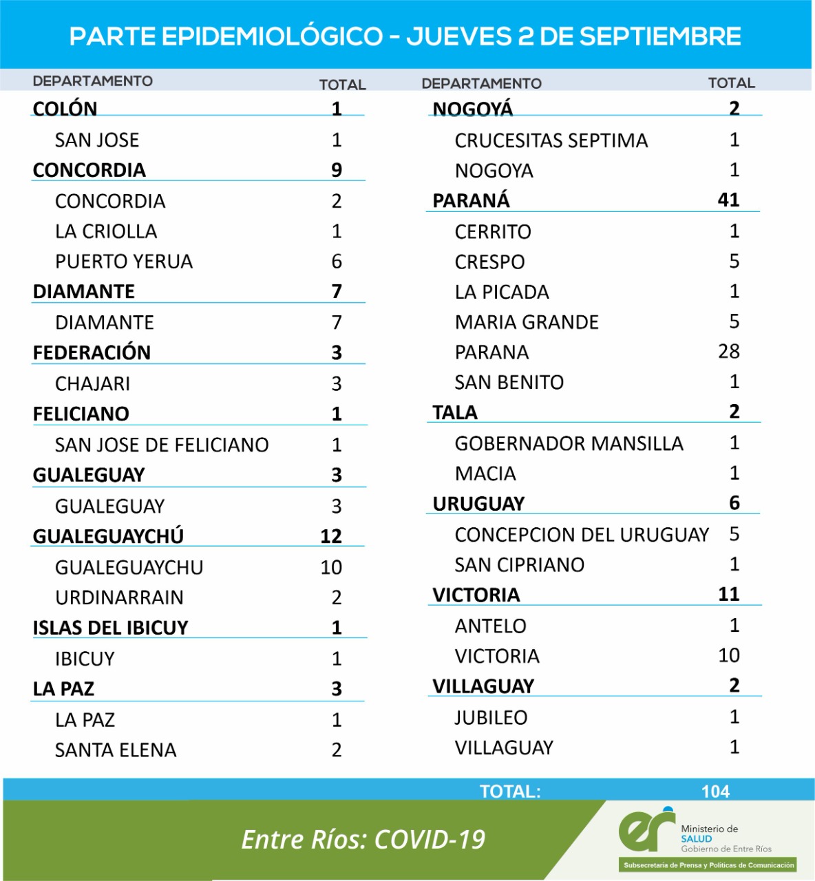 El área de Vigilancia Epidemiológica del Ministerio de Salud confirmó que en Entre Ríos este jueves 2 de septiembre se registraron 104 nuevos casos de coronavirus.