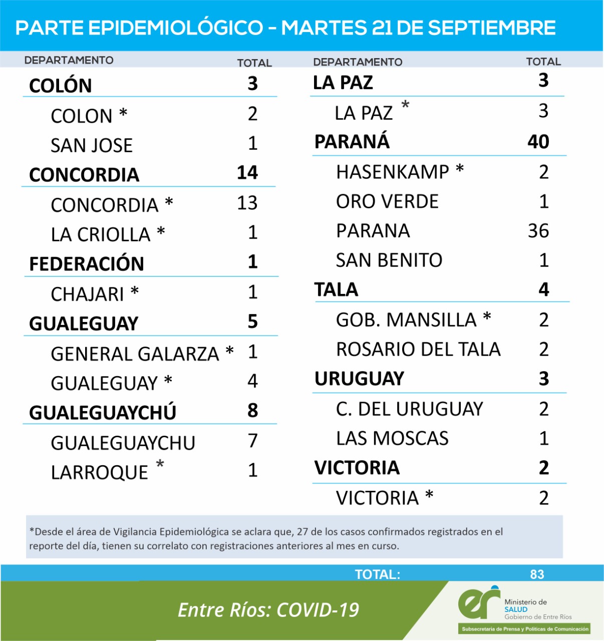 El área de Vigilancia Epidemiológica del Ministerio de Salud confirmó que en Entre Ríos este martes 21 de septiembre se registraron 83 nuevos casos de coronavirus.