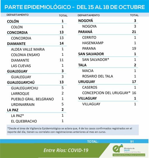 En virtud de los datos reportados por el área de Vigilancia Epidemiológica del Ministerio de Salud en Entre Ríos, se han sumado 91 casos de coronavirus. Los mismos corresponden a la suma de los días viernes 15, sábado 16, domingo 17 y lunes 18.