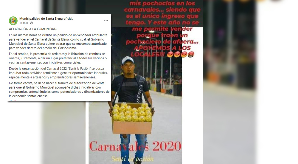 Exequiel González, joven vendedor de pochoclos, denunció ayer por la noche a través de Facebook que no se le permitió trabajar en los Carnavales de Santa Elena. Tras la viralización de su denuncia, el municipio emitió un comunicado en el que aseguró que "se encuentra autorizado para vender dentro del predio del Corsódromo".
