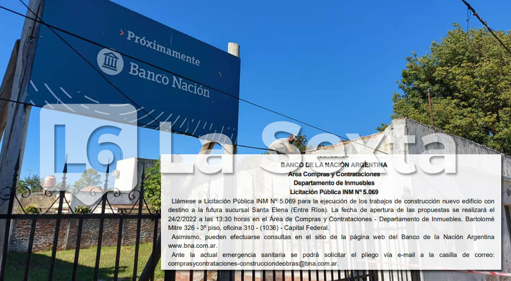 El Banco de la Nación Argentina convocó a licitación para la ejecución de los trabajos de construcción del edificio en la futura sucursal de Santa Elena. El espacio estará en calle Buenos Aires 998, emplazado en la ex casa del Partido Justicialista de la localidad.