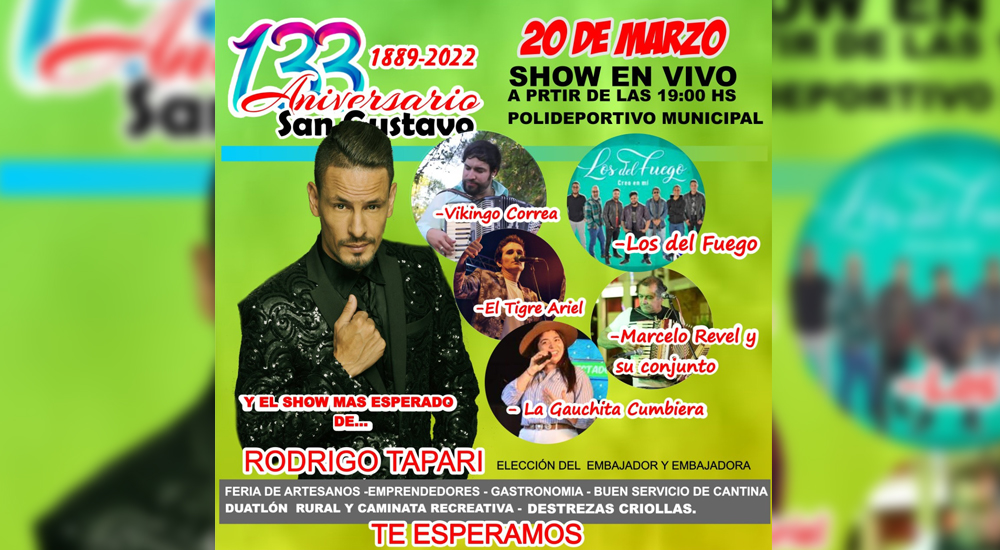 Este domingo se realizará el festejo central del aniversario 133 de San Gustavo. La celebración dará inicio a las 19, en el Polideportivo municipal, con la actuación de Vikingo Correa.