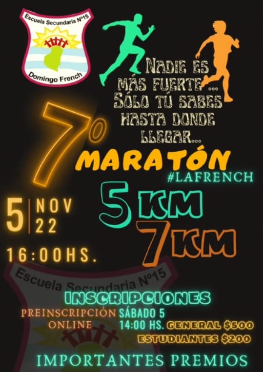 La Escuela Secundaria N° 15 Domingo French de La Paz realiza su séptima Maratón Institucional este sábado a las 16:00 en el nuevo edificio escolar, situado en Avenida Hipólito Irigoyen 3.249.