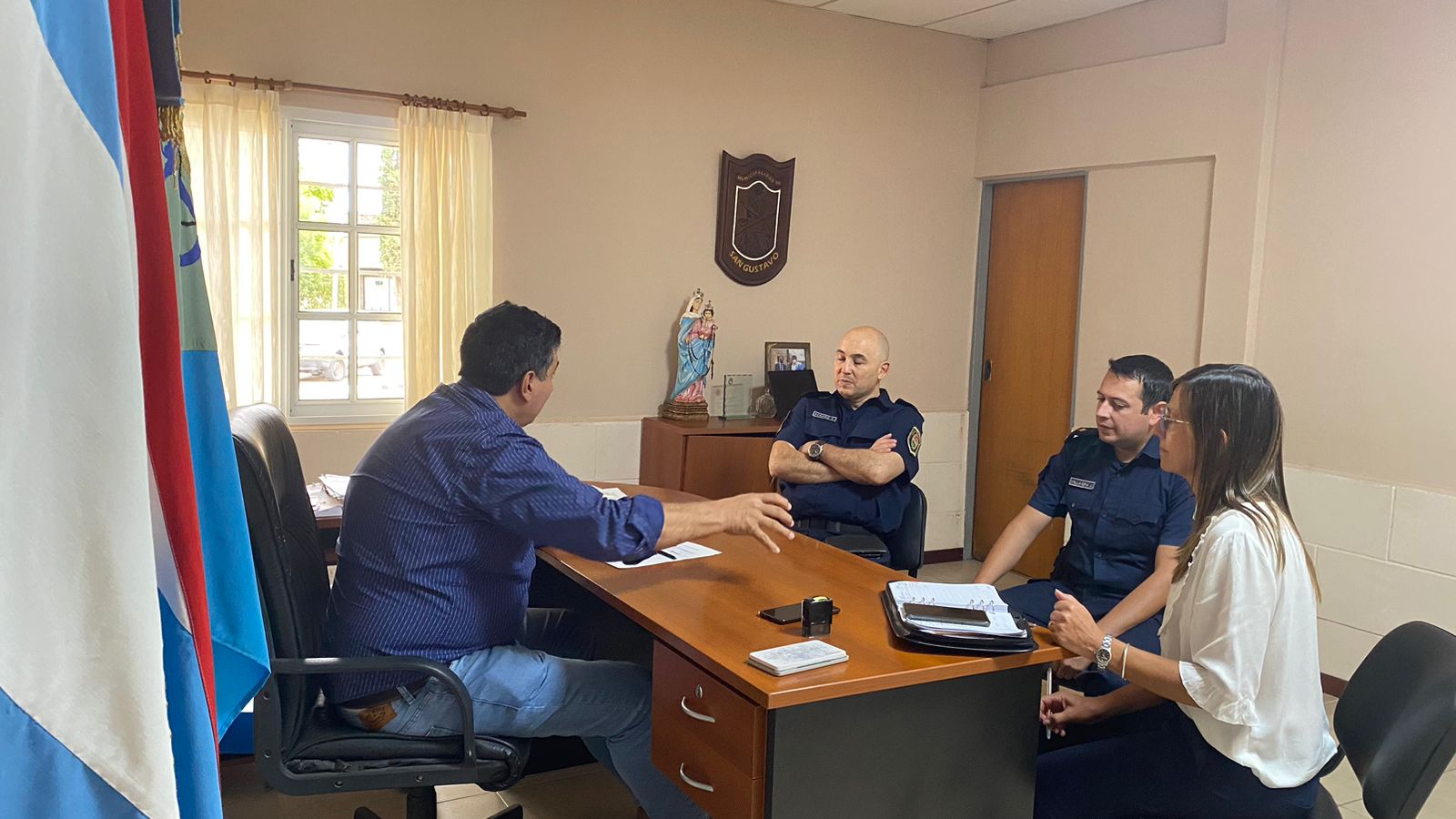 La Municipalidad de San Gustavo y la Policía de Entre Ríos ultimaron detalles para la seguridad en la fiesta del 134 aniversario del sábado 4 de marzo. Este miércoles, el intendente César Simino se reunió con el Jefe Departamental de la Policía, Comisario Inspector Carlos Echaniz; el Jefe de la División de Operaciones, Crio. Ppal; y el Sub Comisario de la Comisaria N°21 de San Gustavo.