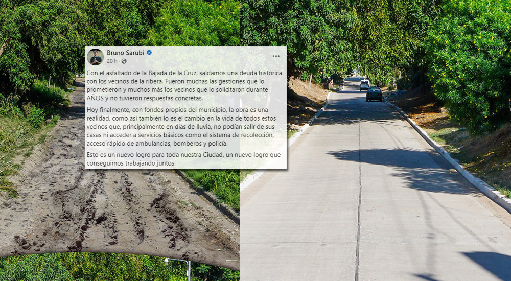 El intendente de La Paz, Bruno Sarubi, mostró en sus redes sociales el "antes y el después" de la obra de pavimentación de la Bajada de la Cruz, en el barrio ribereño de 143 años que es emblemático de La Paz.