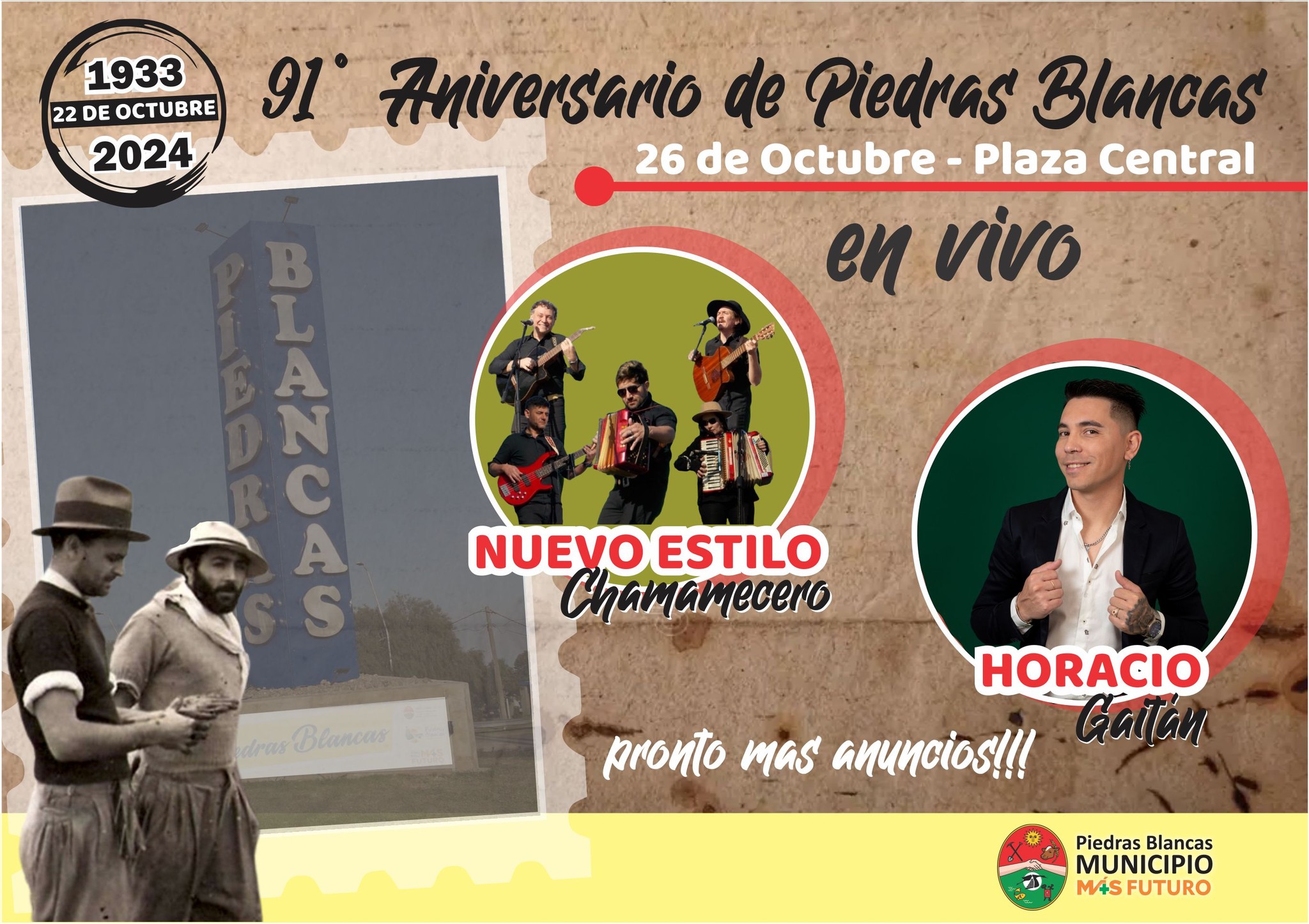 La Municipalidad de Piedras Blancas se encuentra en plena organización de una celebración espectacular para conmemorar el 91° aniversario de la localidad. La festividad, que promete ser un evento inolvidable para todos los habitantes y visitantes, se llevará a cabo el próximo sábado 26 de octubre en la Plaza Central.