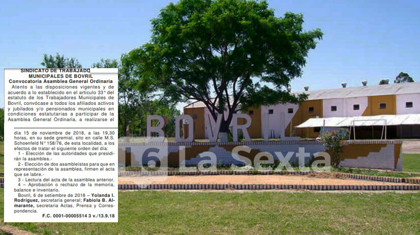 El Sindicato de Trabajadores Municiaples de Bovril convocó a afiliados activos y jubilados su asamblea general ordinaria para el 15 de noviembre, a las 19. 30, en su sede gremial ubicada en calle M.S. Schoenfeld N° 158/76.
