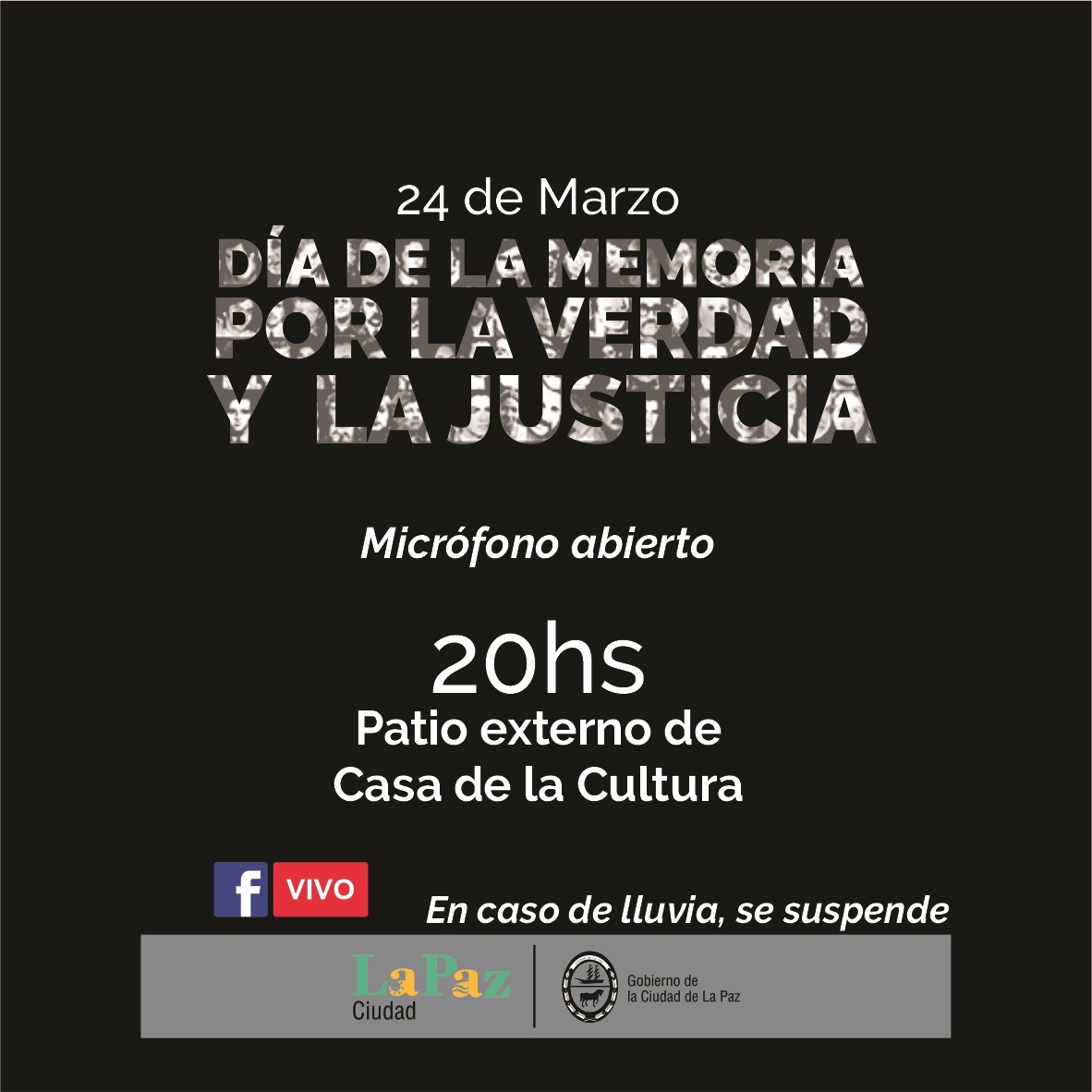 En el marco del 45° aniversario del Golpe de Estado de la última Dictadura Cívico Militar, la Municipalidad de La Paz realizará un acto por el Día de la Memoria por la Verdad y la Justicia mañana miércoles, a las 20. Será en el Patio externo de Casa de la Cultura.