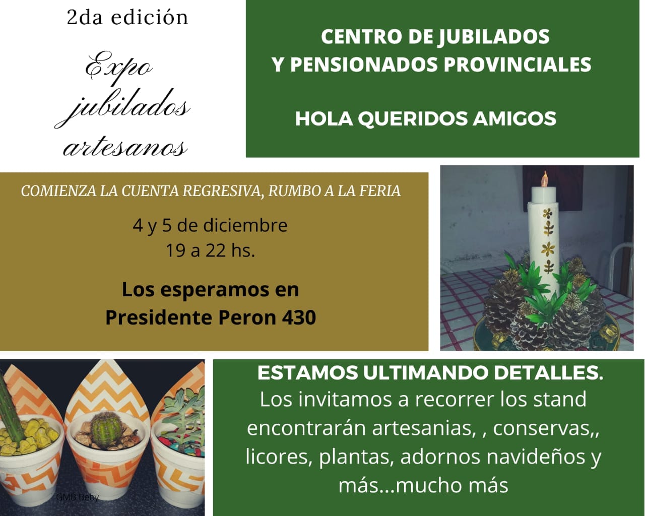 El Centro de Jubilados y Pensionados Provinciales, filial Santa Elena, invitó a participar de la II Expo "Jubilados artesanos" que se realizará mañana sábado 4 y domingo 5 de diciembre, entre las 19 y las 22. La actividad será en la sede de Avenida Presidente Perón Nº 430.