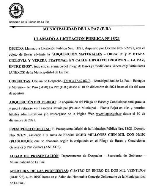 La adquisición del Pliego de Bases y Condiciones será gratuita y podrá retirarse en Tesorería Municipal (Palacio Municipal – Planta Baja) en días y horarios hábiles administrativos y/o descargarse de la Página Web www.lapaz.gob.ar desde el 10 de diciembre de 2021.