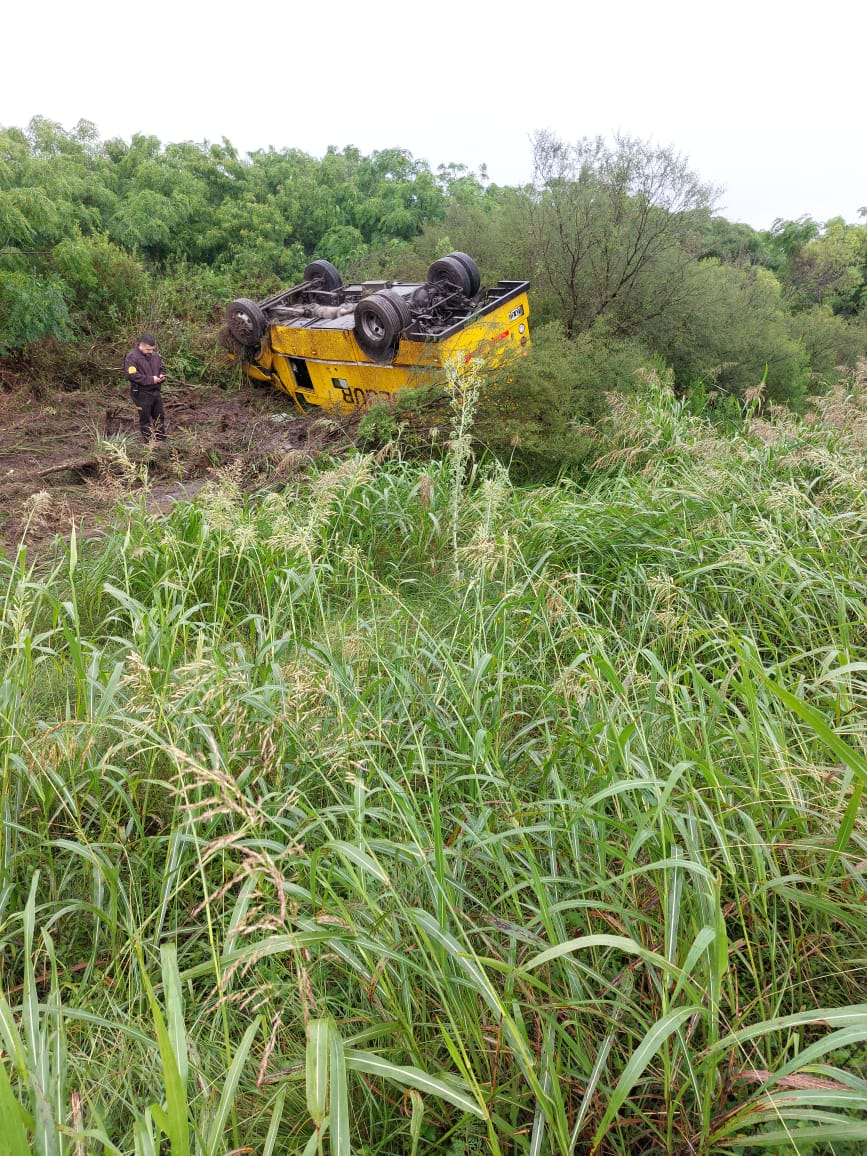 Un camión de caudales volcó en el kilómetro 567 de la Ruta Nacional N° 12, en jurisdicción de El Solar, el mediodía de este lunes en medio de las condiciones meteorológicas adversas que se registraron en la región.