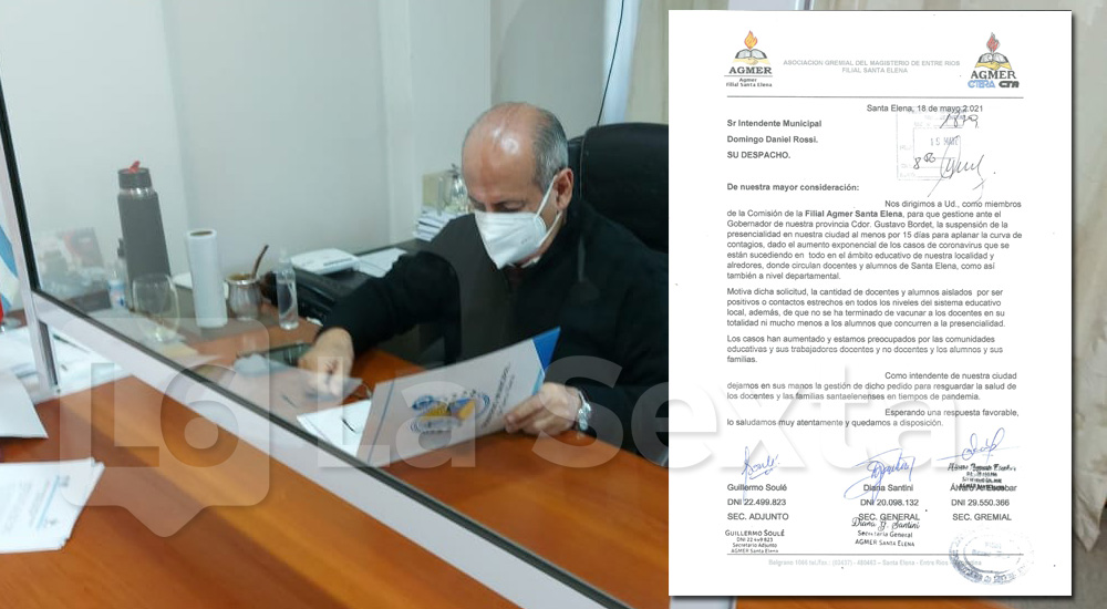 En el escrito, fechado ayer martes, los dirigentes pidieron al jefe comunal que solicite al gobernador Gustavo Bordet la suspensión de la presencialidad en las escuelas "al menos por 15 días para aplanar la curva de contagios, dado el aumento exponencial de los casos de coronavirus que se están sucediendo en todo el ámbito educativo de nuestra localidad y alrededores, donde circulan docentes y alumnos de Santa Elena , como así también a nivel departamental".