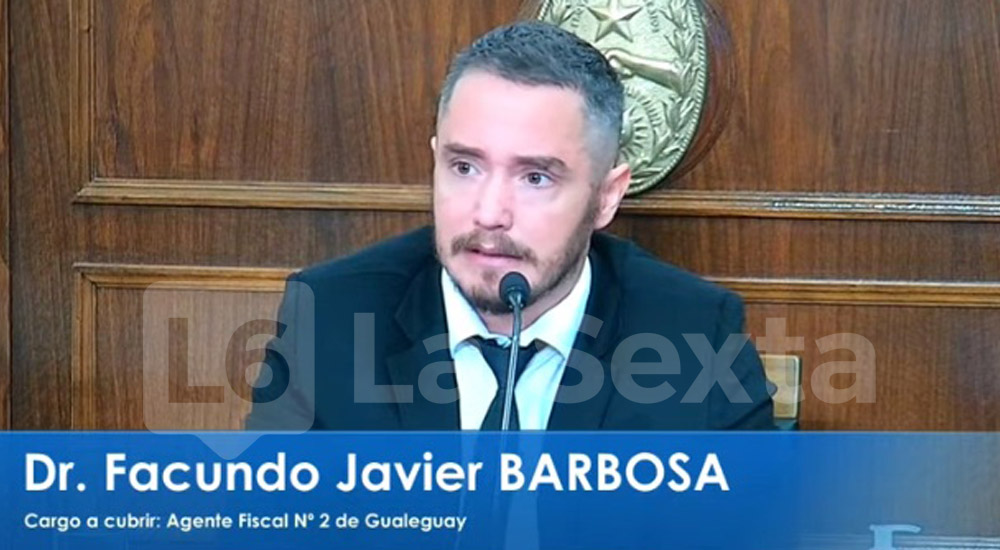 El fiscal de La Paz, Facundo Barbosa, que aspira a convertirse en fiscal de Gualeguay, habló este jueves por primera vez de la impugnación a su pliego formulada por el exjuez del Superior Tribunal de Justicia, Emilio Castrillón. Lo hizo en el marco de la audiencia pública ante la Comisión de Asuntos Constitucionales del Senado. Allí, calificó de "oscura" e "hilarante" la versión de los hechos que esgrimió el exjuez.