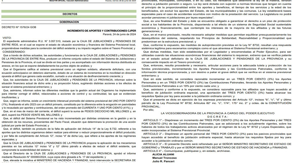 El gobierno provincial publicó en el Boletín Oficial el decreto Nº 1.576, fechado el lunes 24 de junio, en el que implementa la reforma del sistema jubilatorio provincial, anunciada el 31 de mayo pasado. La reforma implica un aumento del aporte previsional personal de los trabajadores del Estado, que pasa del 16% al 19%. Además, establece una alícuota adicional del 3% para los agentes en regímenes especiales, como los docentes que se jubilan antes.