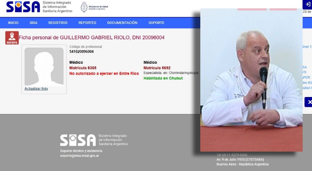 El médico otorrinolaringólogo Guillermo Riolo, quien se encuentra bajo investigación por la muerte de Facundo Barrios en el marco de una causa por presunta mala praxis y homicidio culposo, está actualmente habilitado para ejercer la medicina en la provincia de Chubut. Así lo señalan registros oficiales consultados por la familia del menor fallecido en septiembre de 2024 en una Clínica del Sol de Bovril, quienes confirmaron que Riolo figura con matrícula activa en esa jurisdicción. El dato figura en el Sistema Integrado de Infdormación Sanitario Argentino, que depende del Ministerio de Salud de la Nación. Cabe recordar que el médico tiene la matrícula suspendida en la provincia de Entre Ríos.
