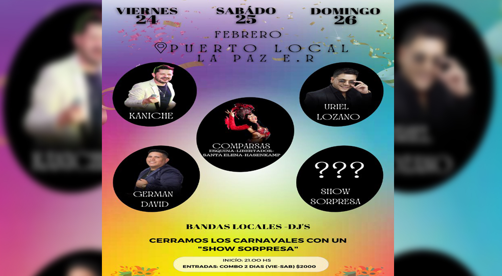 Sobre el orden que tendrá cada show en la fiesta, se explicó que el viernes 24 se presentará el grupo Kaniche y una comparsa de Esquina; el sábado actuarán bandas locales, comparsas locales, una de Esquina, y estará el show de Uriel Lozano; y que el domingo será el turno de una comparsa de Hasenkamp y Libertador, la presentación de Germán David y un espectáculo musical sorpresa.