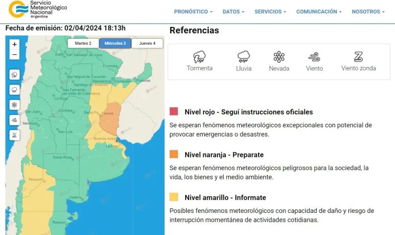 El Servicio Meteorológio Nacional (SMN) difundió un alerta naranja para el departamento La Paz debido a la previsión de tormentas para el miércoles por la mañana y tarde. En rigor, el alerta incluye a todo el territorio provincial. Se prevé que las condiciones meteorológicas adversas se manifiesten en forma de precipitaciones y tormentas eléctricas, algunas con potencial de ser excepcionalmente fuertes.